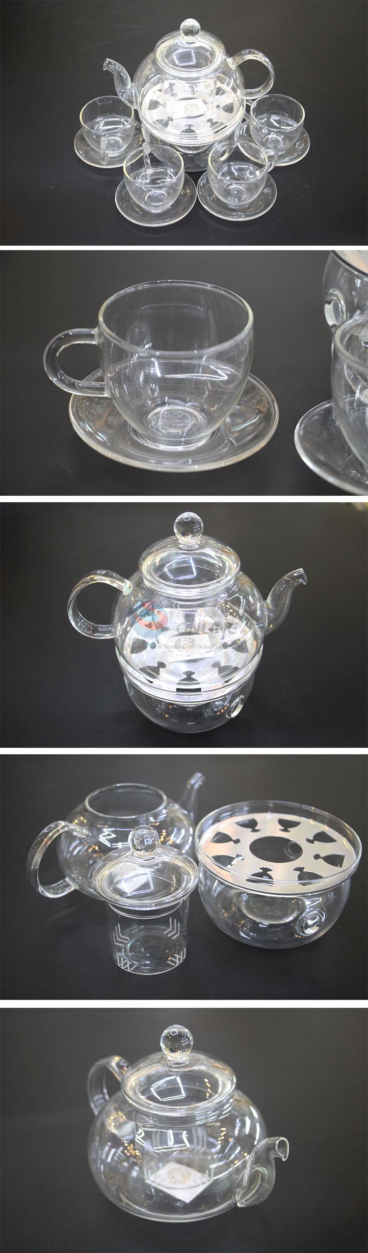 Wholesale Glass Teapot with Wamer Base and 4 Pieces teacups,Heat-resistant ,clear glass