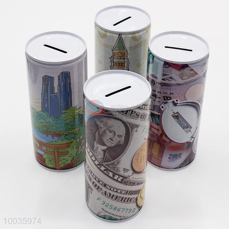 Kids Iron Money Box Shaped in cylinder with Modern Building Pattern