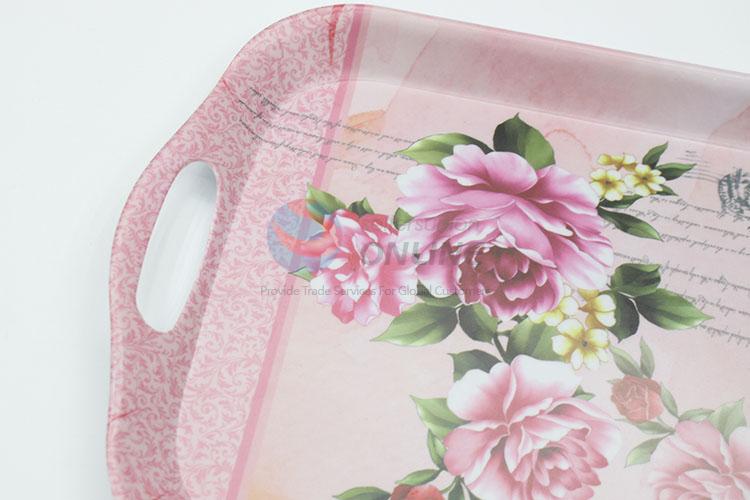 Pink rectangular melamine serving tray with handle
