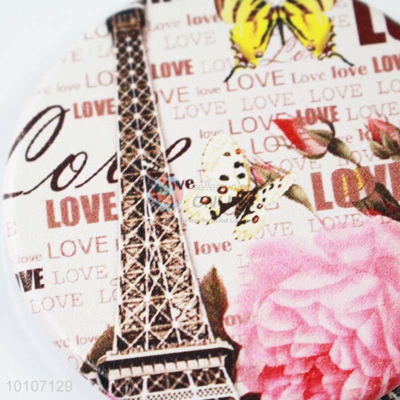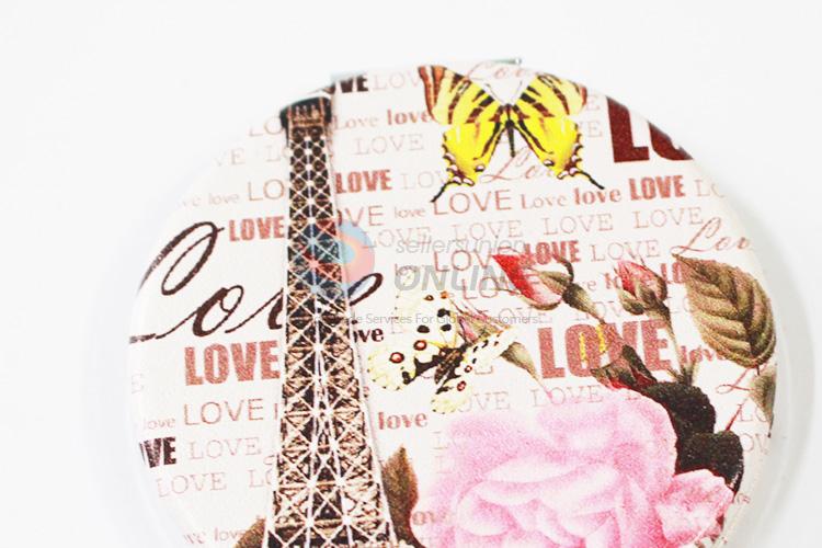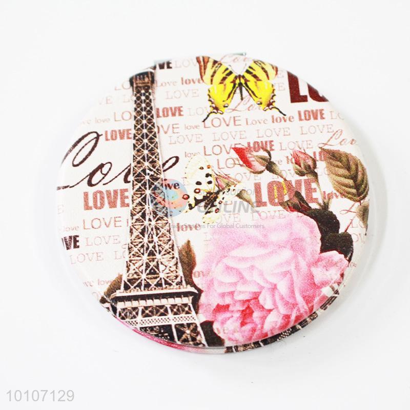 Pink Rose Pattern Metal Round Pocket Make-up Mirror