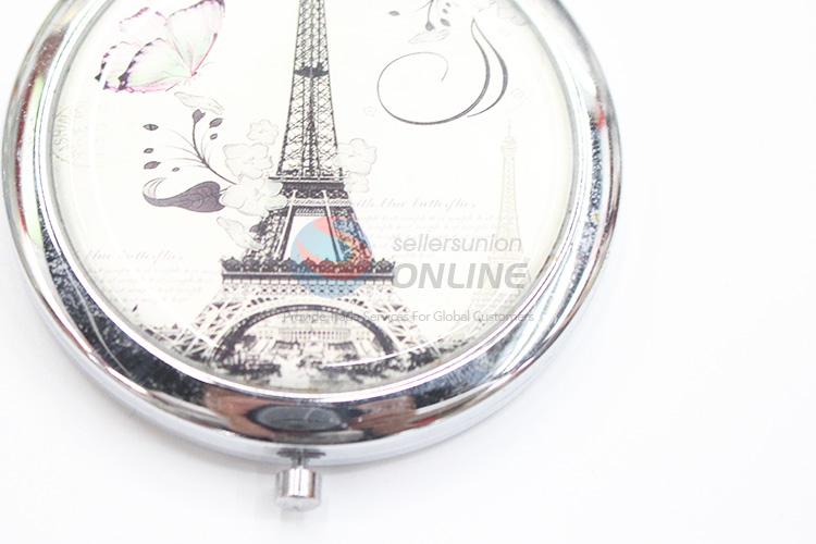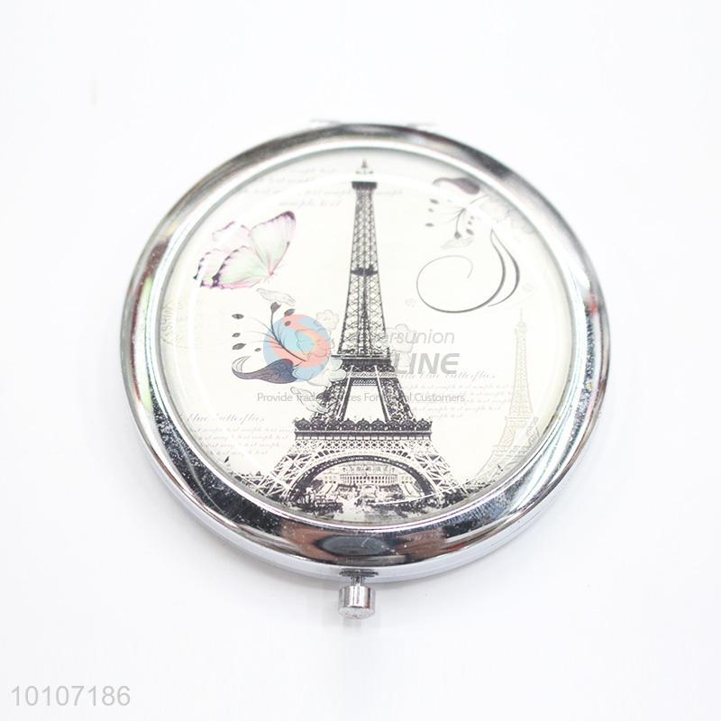 Tower and Butterfly Pattern Round Metal Pocket Makeup Mirror