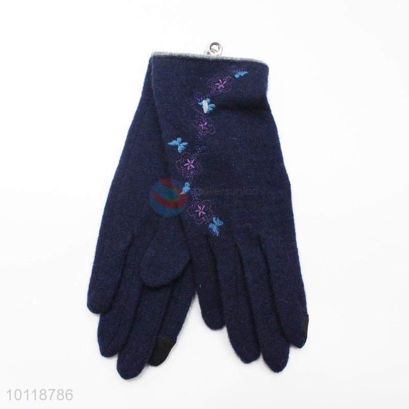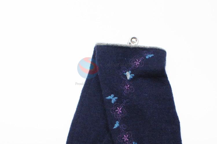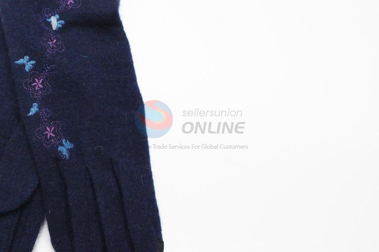 Dark Blue Flower Pattern Cashmere Gloves