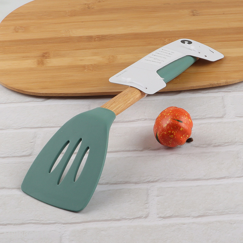 Factory supply flexible silicone slotted spatula turner with wooden handle